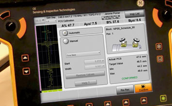 按照向?qū)瓿商筋^和楔塊驗(yàn)證,校準(zhǔn)(PCS和TOFD靈敏度、校驗(yàn)、晶片單元和楔塊檢查、記錄相控陣的DAC/TCG曲線),掃查設(shè)置和校準(zhǔn)。