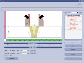 隨后這些設(shè)置信息需要高級超聲技術(shù)人員進(jìn)行驗(yàn)證。每個焊縫分成多個TOFD和相控陣檢測區(qū)域,高級技術(shù)人員可以通過聲束模擬功能驗(yàn)證每個區(qū)域超聲覆蓋是否準(zhǔn)確。也可以通過選擇數(shù)據(jù)庫中的其他探頭,調(diào)整探頭位置。當(dāng)所有的檢測區(qū)域被驗(yàn)證后,檢測方案可以被導(dǎo)出到掃查儀器中。