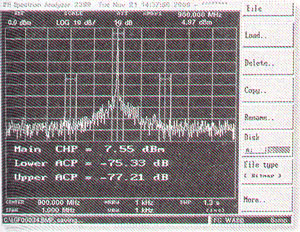 顯示的水平軸(頻率軸)中心頻率為900MHz,掃頻頻寬為1MHz,而每一小格代表l00kHz。頂部水平線表示0dBm,垂直方向每一格代表10dB。信號已經(jīng)被衰減了10dB,測量顯示的功率電平已考慮了此衰減。