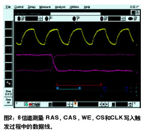 如圖2所示16條邏輯定時信道用來設置在RAS高、CAS低、WE高和CS上觸發(fā)系統(tǒng)。示波器信道1用來察看和抽換法時鐘的上升沿。在邏輯分析儀和示波器組合解決方案中邏輯分析儀只能交叉觸發(fā)示波器或反之與此不同混合信號示波器可以在示波器和邏輯定時信道中進行全寬觸發(fā)。