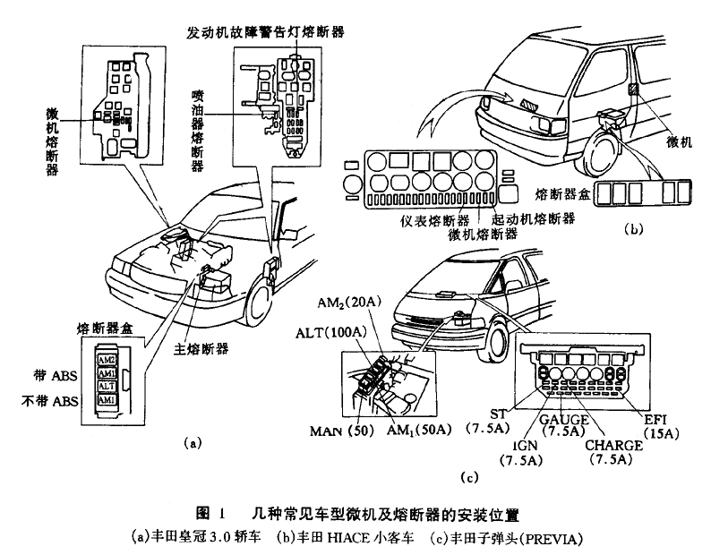 (1)在檢測之前,數(shù)顯測振儀應(yīng)先檢查汽車微機(jī)控制系統(tǒng)及其他電氣系統(tǒng)各熔斷器、熔斷絲及有關(guān)的線束插頭(連接器)是否良好。幾種常見車型微機(jī)及熔斷器的安裝位置如圖 1所示其他車型參見維修手冊。