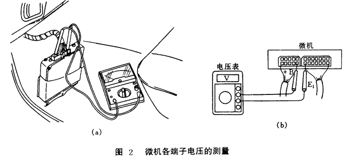 。6)記錄各端子與搭鐵端子間的電壓值并與標(biāo)準(zhǔn)檢測數(shù)據(jù)相比較。如測得的電壓與標(biāo)準(zhǔn)值不符則說明微機(jī)或控制線路有故障。