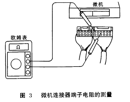 (3)如圖 3所示用萬用表歐姆檔測量導(dǎo)線連接器各端子間電阻值(注意:不要觸碰微機(jī)的接線端子應(yīng)將測筆從導(dǎo)線側(cè)插入導(dǎo)線連接器中)。