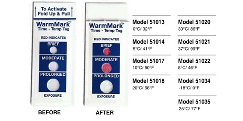 WarmMark 溫度標(biāo)簽,型號(hào)51013-51035,, 監(jiān)控產(chǎn)品在運(yùn)輸、 儲(chǔ)存或處理過程中的溫度。反應(yīng)溫度范圍可從-18℃至37℃。這些不干膠標(biāo)簽直接適用于產(chǎn)品、包裝、紙箱或大包裝上。一旦反應(yīng)溫度達(dá)到或超過,,標(biāo)簽便被激 活而發(fā)生不可逆變色。紅色顯示溫度的閾值外暴露經(jīng)過了一個(gè)短暫,,中等或長久的時(shí)間段。你一眼便能看出是否有溫度閾值外暴露發(fā)生,,提供質(zhì)量保證的永久記錄。